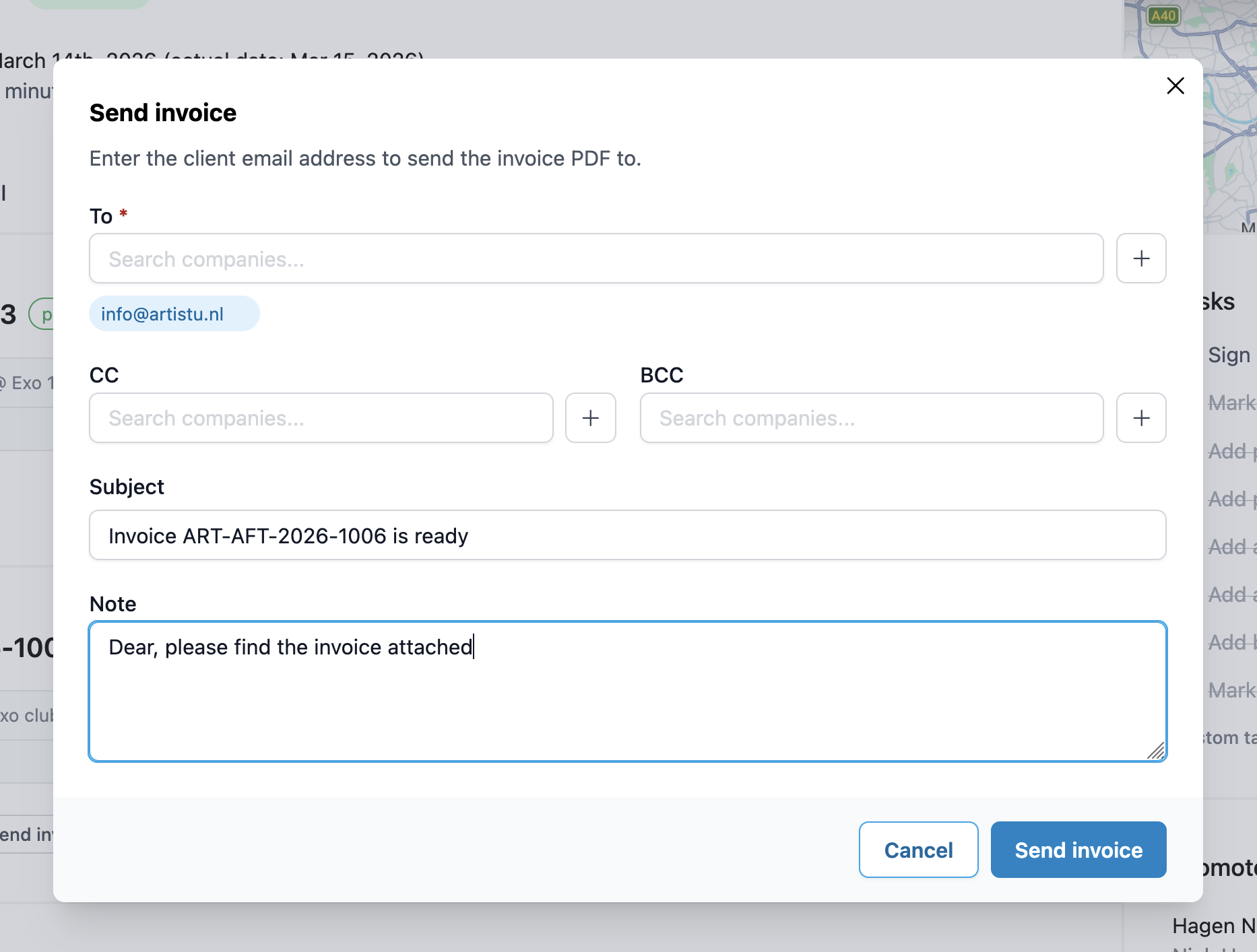 Générez une facture depuis votre réservation en deux clics. Envoyez-la directement au client par e-mail, ou via la facturation Peppol pour les agences européennes. La facture arrive dans le système comptable du client sans que personne n'ait à imprimer ou joindre un fichier.
