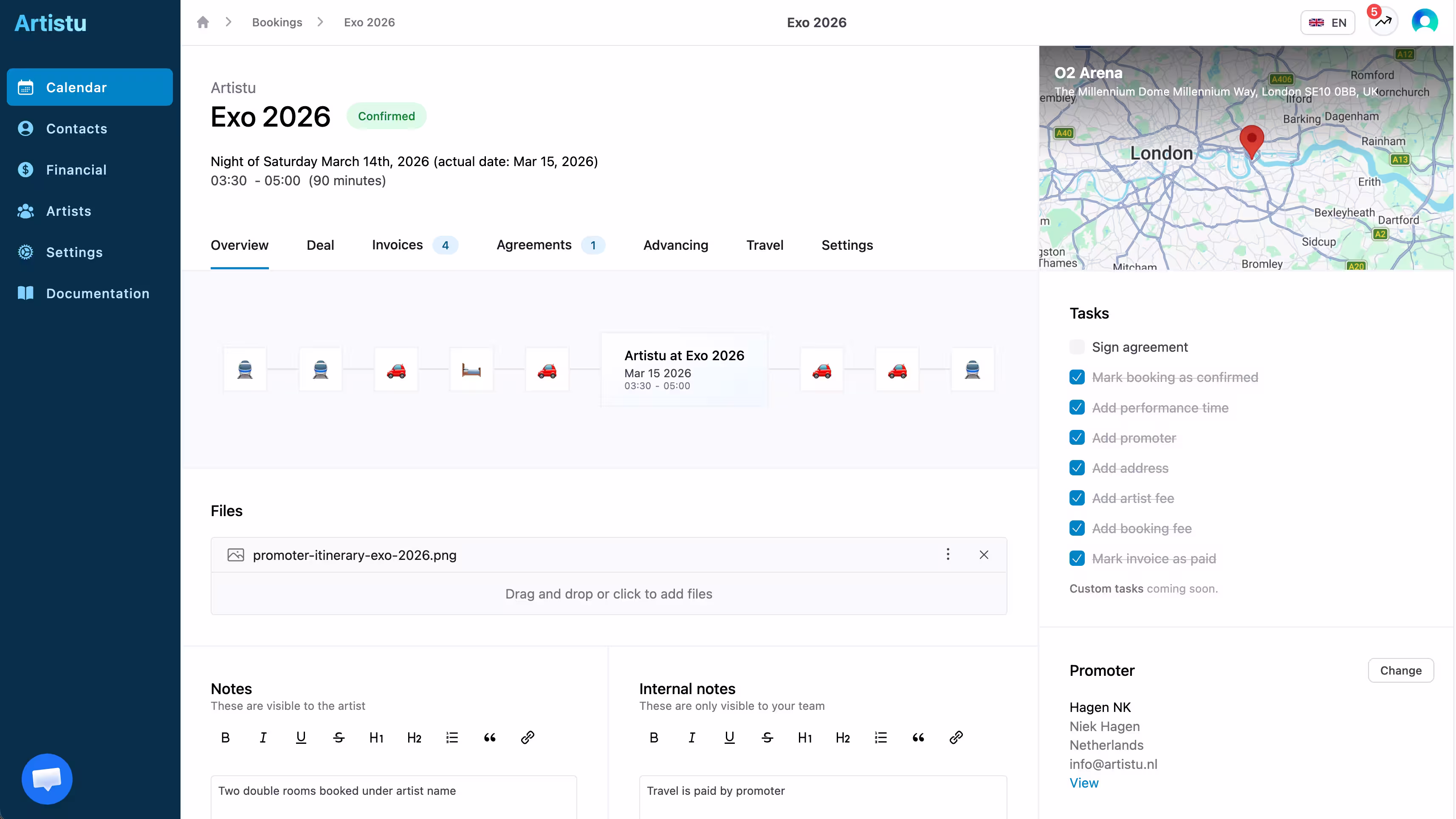 Artistu vous donne une vue unique sur toutes les réservations de votre roster, avec le statut en un coup d'oeil : demande, option, hold, confirmée ou annulée. Les artistes voient leurs dates confirmées sans que vous ayez à transférer les infos manuellement.