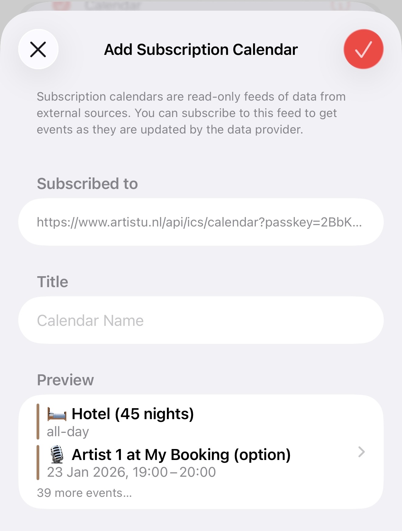 Vous pouvez synchroniser votre planning de réservations Artistu directement sur votre calendrier Apple (Apple Calendar) sur iPhone ou iPad en utilisant une URL d'abonnement. Cela garantit que votre calendrier mobile est toujours à jour avec vos dernières réservations.