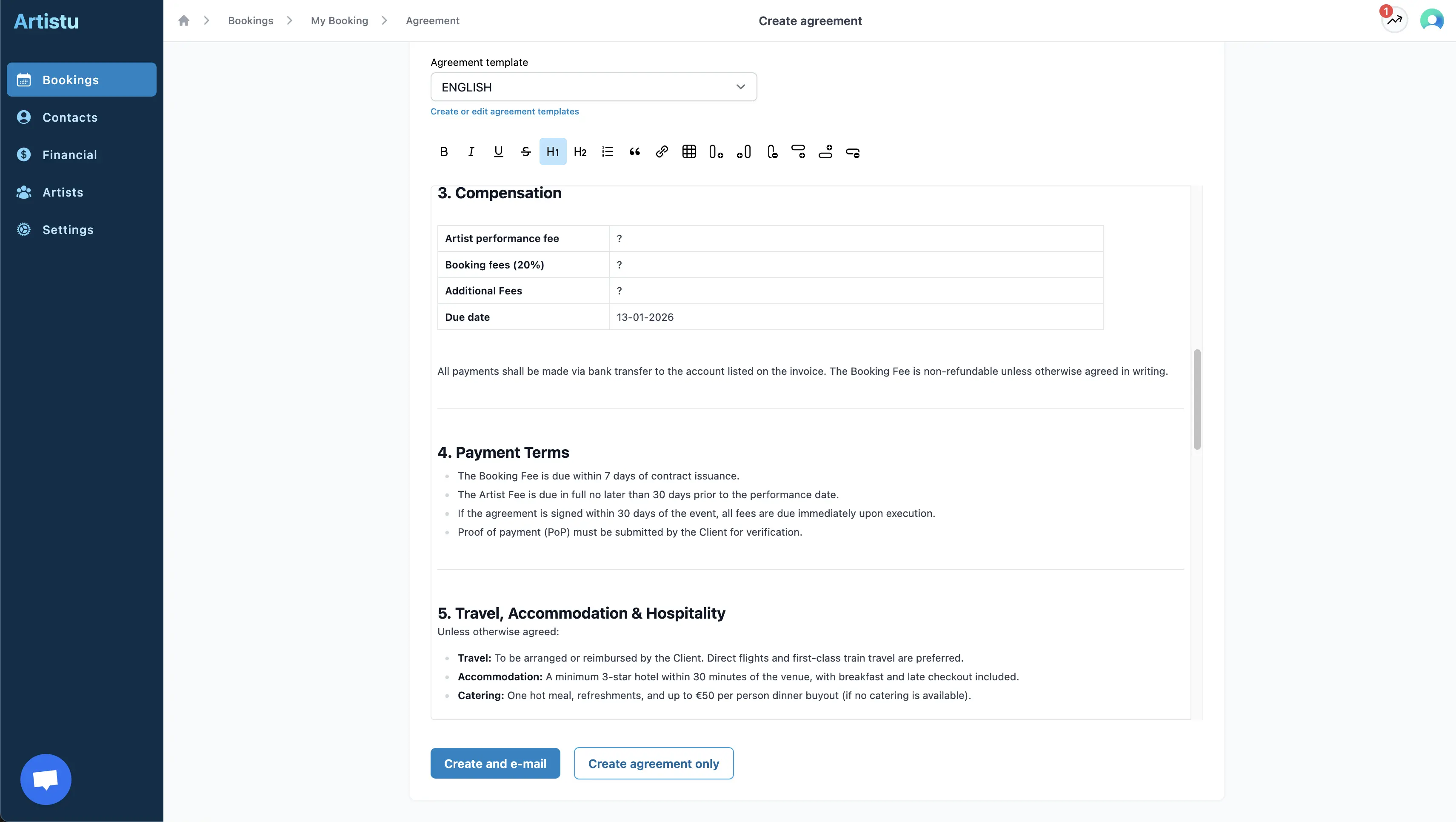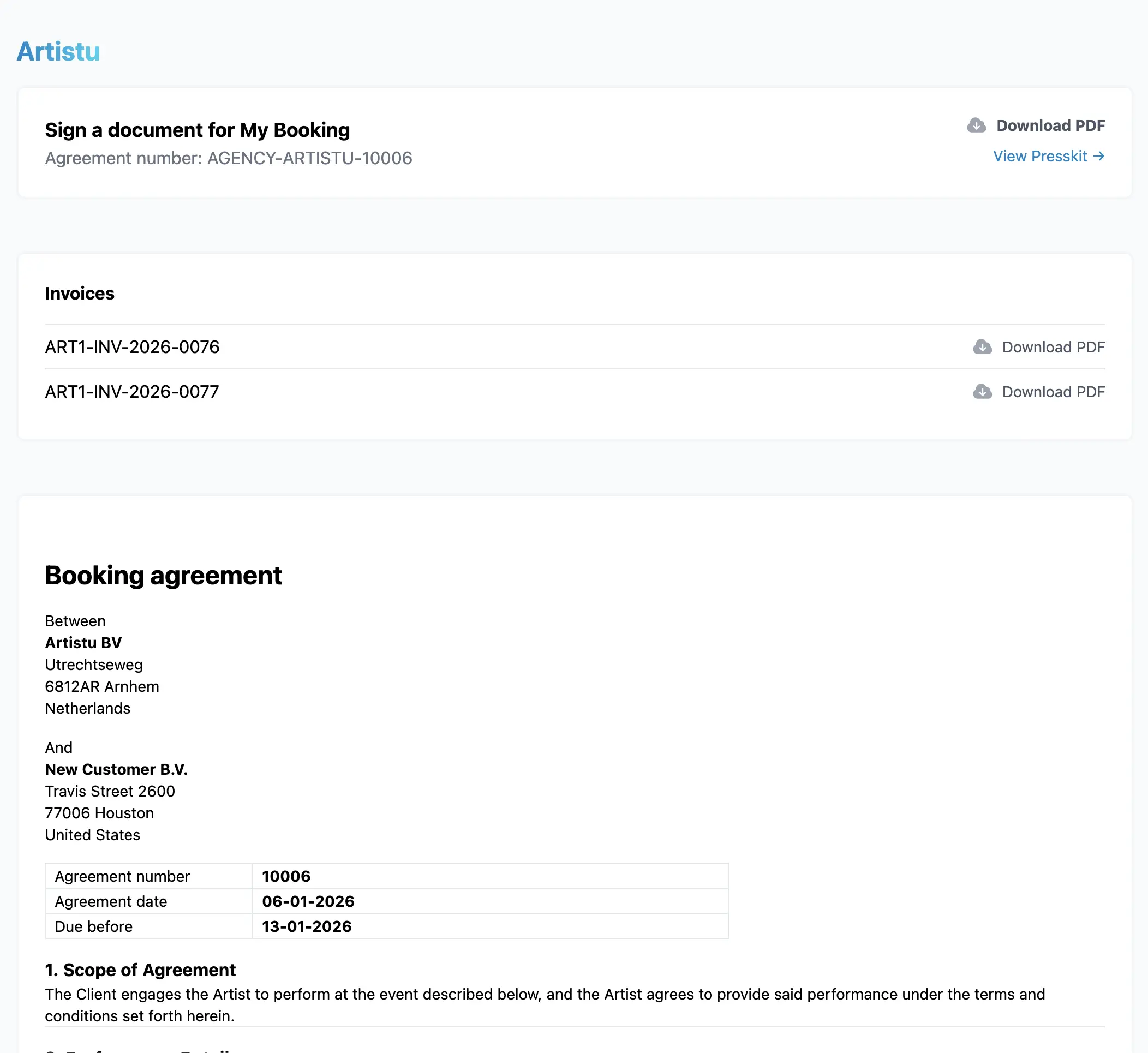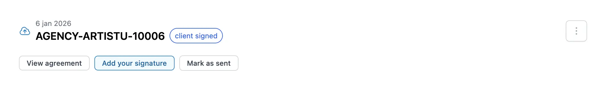 Artistu vous permet d'envoyer vos contrats (accords) pour signature numérique directement depuis la plateforme. Cela simplifie le processus de booking et centralise tout au même endroit.