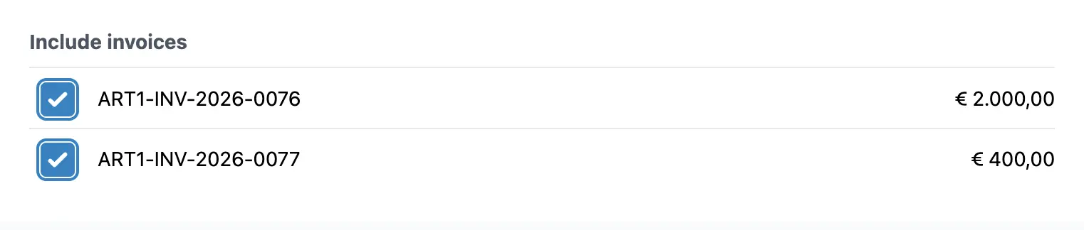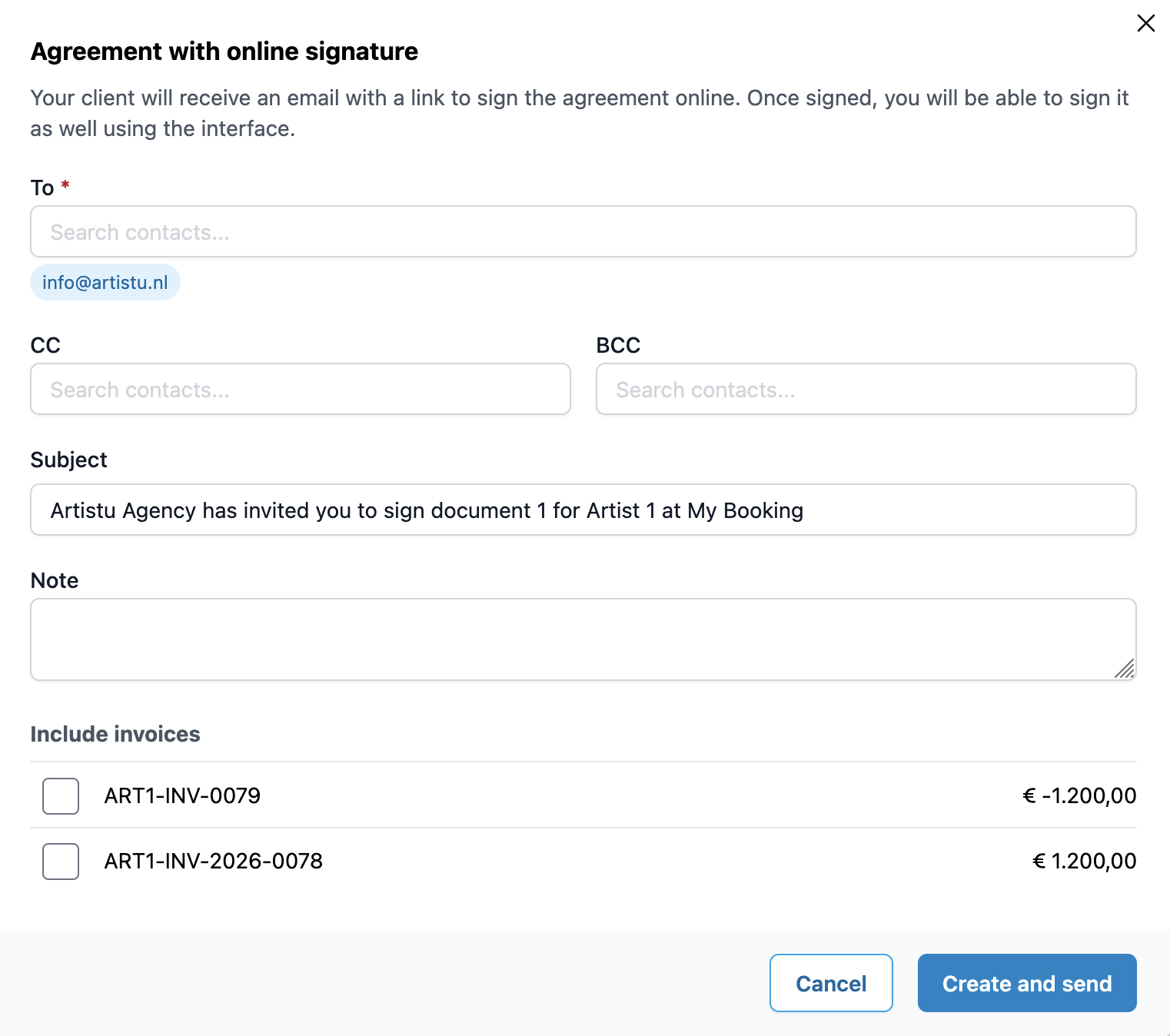 Si vous avez créé des factures pour ce booking, vous pouvez choisir de les inclure dans la demande de signature. De cette façon, le promoteur reçoit tout ce dont il a besoin en une seule fois.
