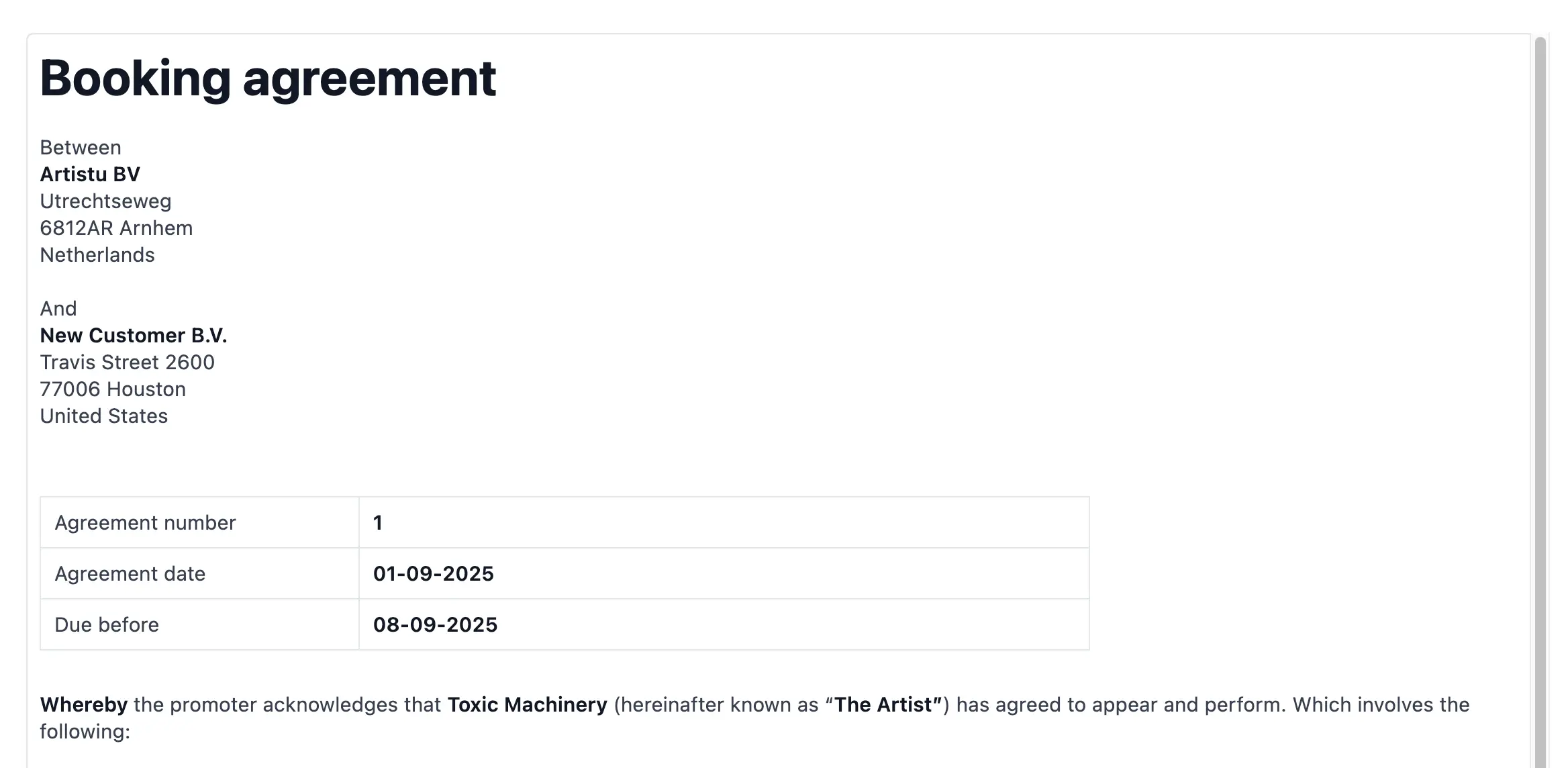 Les modèles de contrat constituent une partie importante de la manière dont Artistu gère la contractualisation pour votre agence. Dans le modèle, vous définissez une structure avec des variables qui seront remplacées par les valeurs réelles du booking lors de la création d'un contrat.