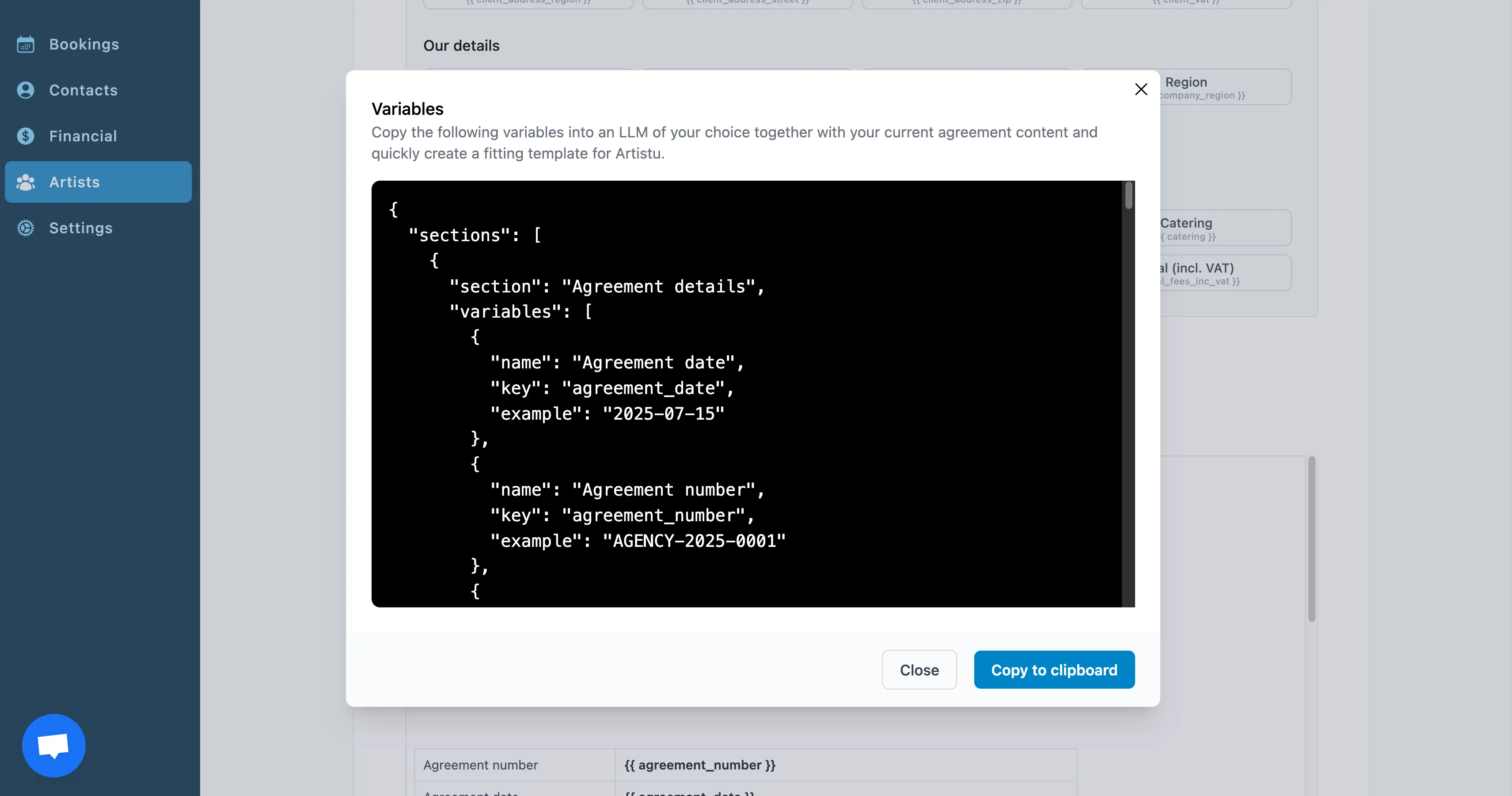 La base du fonctionnement des modèles de contrat dans Artistu repose sur l'utilisation de variables. Les variables sont des espaces réservés qui seront remplacés par les valeurs réelles du booking lors de la création d'un contrat.