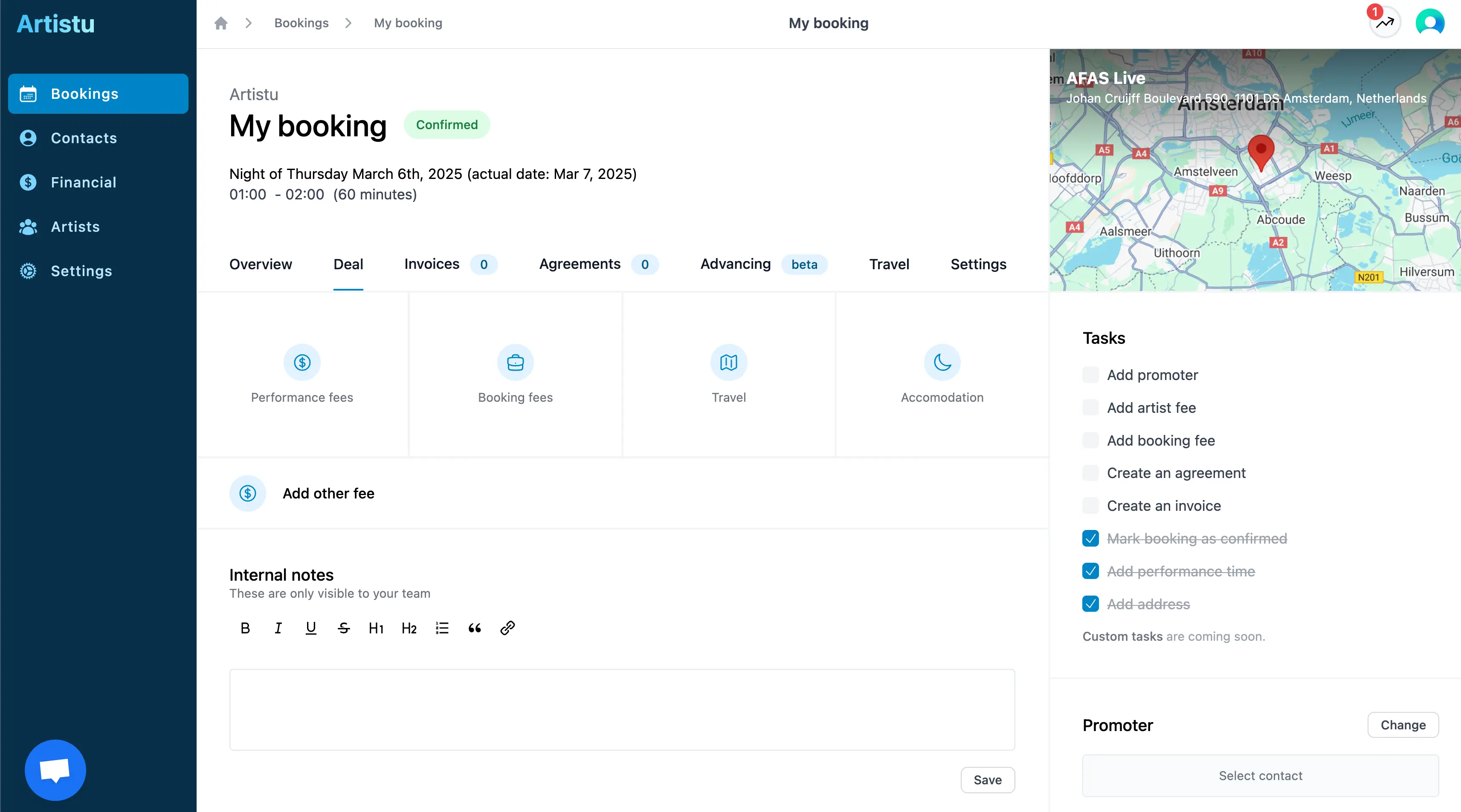 Ce guide vous montrera comment gérer différents types de contrats (deals) pour les bookings de votre agence dans Artistu.